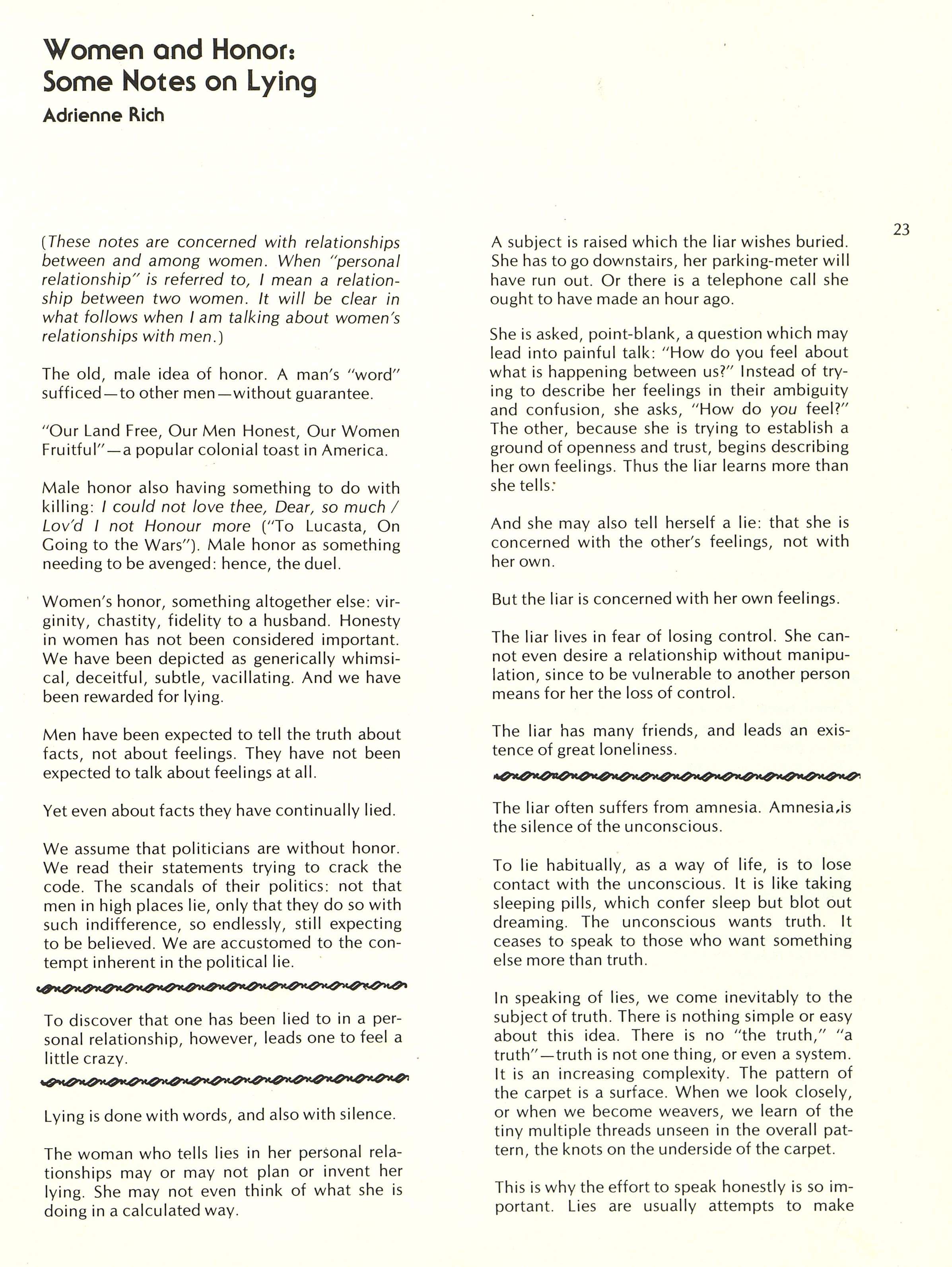 And so we must take seriously the question of truthfulness between women, truthfulness among women. As we cease to lie with our bodies, as we cease to take on faith what men have said about us, is a truly womanly idea of honor in the making?