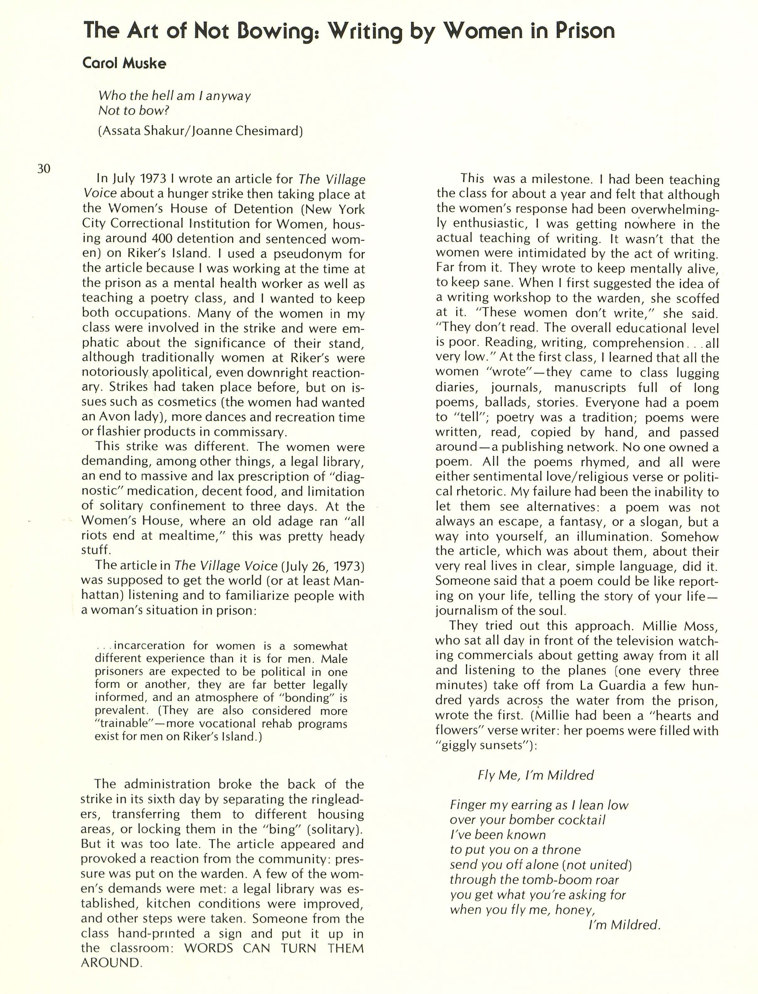 In July 1973 I wrote an article for The Village Voice about a hunger strike then taking place at the Women's House of Detention (New York City Correctional Institution for Women, housing around 400 detention and sentenced women) on Riker's Island. I used a pseudonym for the article because I was working at the time at the prison as a mental health worker as well as teaching a poetry class, and I wanted to keep both occupations. Many of the women in my class were involved in the strike and were emphatic about the significance of their stand, although traditionally women at Riker's were notoriously apolitical, even downright reactionary. Strikes had taken place before, but on issues such as cosmetics (the women had wanted an Avon lady), more dances and recreation time or flashier products in commissary.