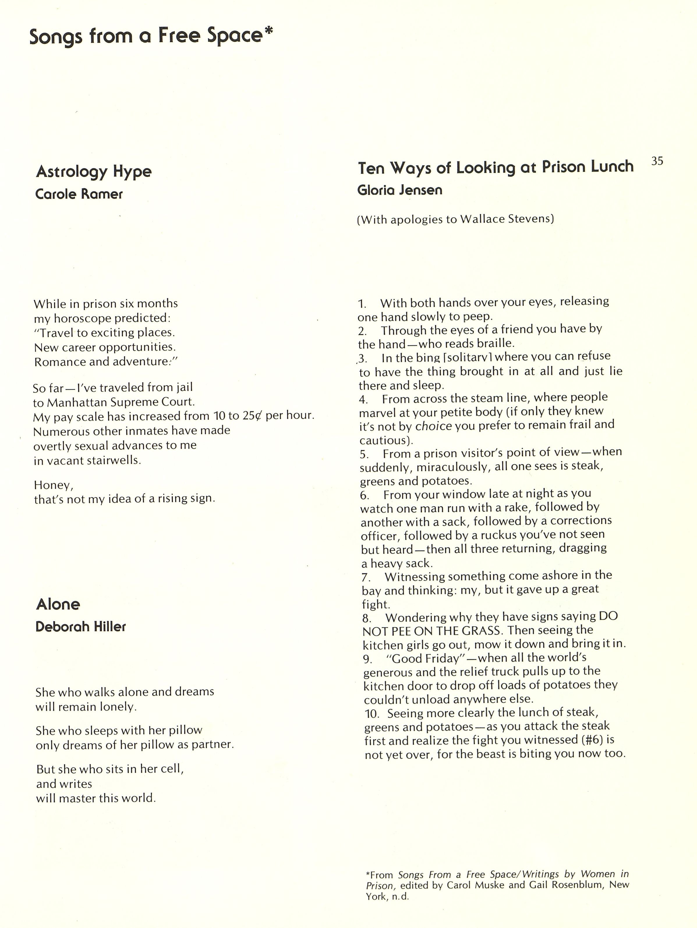 From Songs from a Free Space/Writings by Women in Prison, edited by Carol Muske and Gail Rosenblum, New York, n. d.