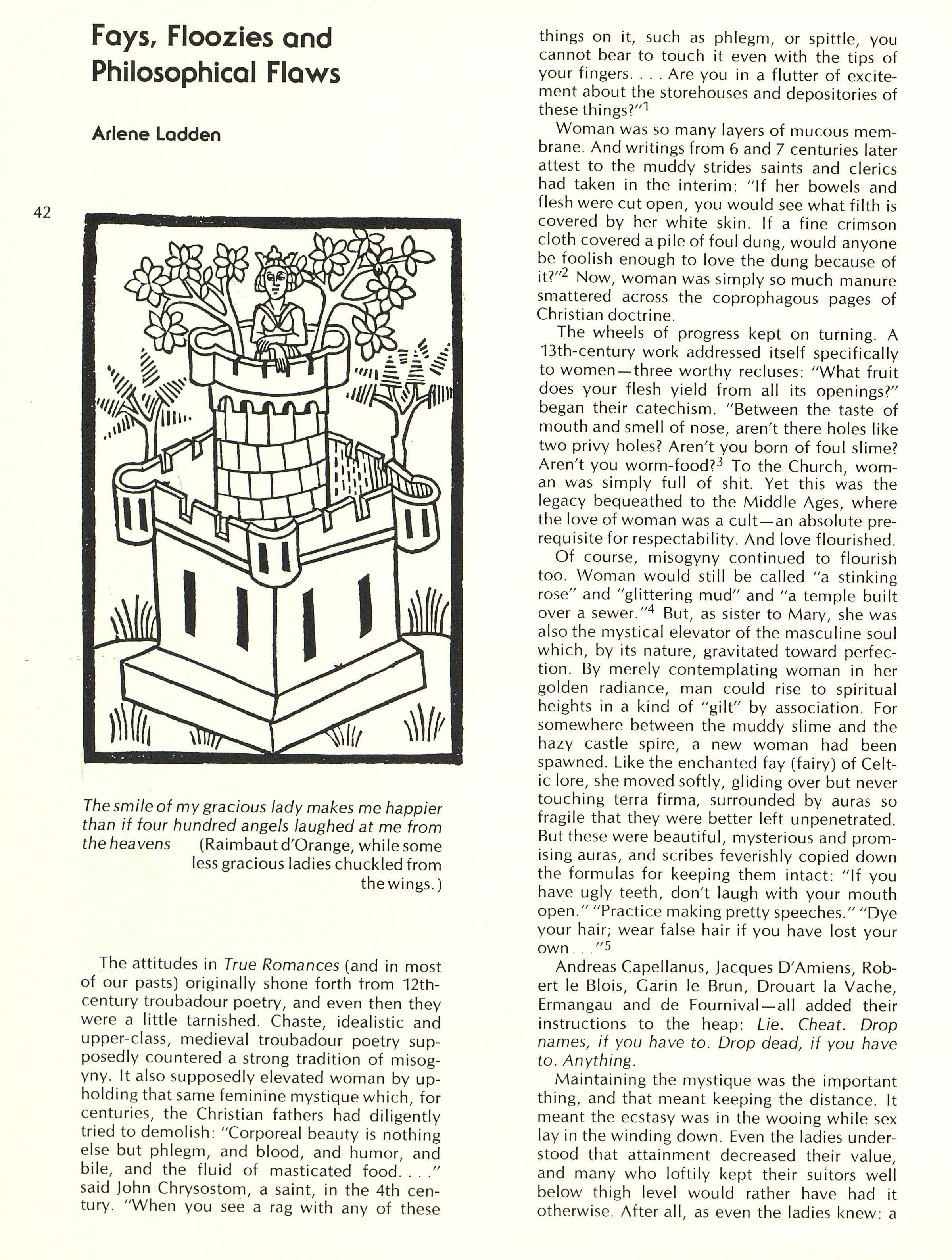 The attitudes in True Romances (and in most of our pasts) originally shone forth from 12th-century troubadour poetry and even then they were a little tarnished. Chaste, idealistic and upper-class, medieval troubadour poetry supposedly countered a strong tradition of misogyny. It also supposedly elevated woman by upholding that same feminine mystique which, for centuries, the Christian fathers had diligently tried to demolish: "Corporeal beauty is nothing else but phlegm, and blood, and humor, and bile, and the fluid of masticated food...." said John Chrysostom, a saint, in the 4th century. "When you see a rag with any of these things on it, such as phlegm, or spittle, you cannot bear to touch it even with the tips of your fingers. . . . Are you in a flutter of excitement about the storehouses and depositories of these things?" (Note: "An Exhortation to Theodore after His Fall," in A Select Library of the Nicene and Post-Nicene Fathers, ed. Philip Schaff et al. (New York, 1889), IX, 103-104.)